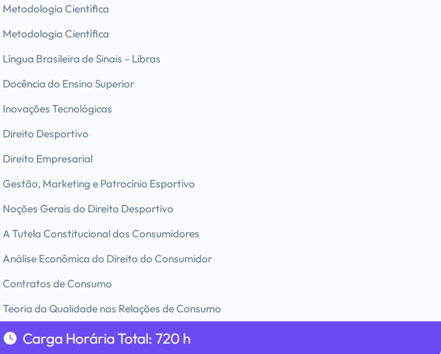 O curso de pós-graduação em Direito Desportivo e Direito do Consumidor tem como objetivo capacitar profissionais para atuar na interseção entre o direito e o esporte, abordando questões jurídicas relacionadas à regulamentação das atividades esportivas, contratos de atletas, clubes e federações, além da proteção dos direitos dos consumidores no contexto desportivo. O curso visa proporcionar conhecimentos teóricos e práticos, habilitando os alunos a resolver conflitos jurídicos e a atuar de forma eficiente nas demandas desse setor.
