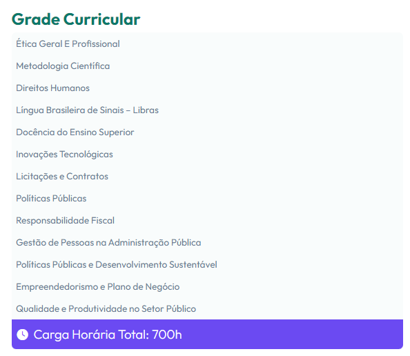 O curso de pós-graduação em MBA em Administração Pública tem como objetivo profissionais para atuar na gestão eficiente e ética de organizações públicas, promovendo políticas públicas e serviços de qualidade para a sociedade. A formação abrange temas como planejamento estratégico governamental, gestão orçamentária e financeira, direito administrativo, governança pública, transparência e controle social, além de liderança e inovação no setor público. O curso prepara os alunos para ocupar cargos de gestão em órgãos públicos, oferecendo soluções eficazes e alinhadas às demandas sociais e legais.